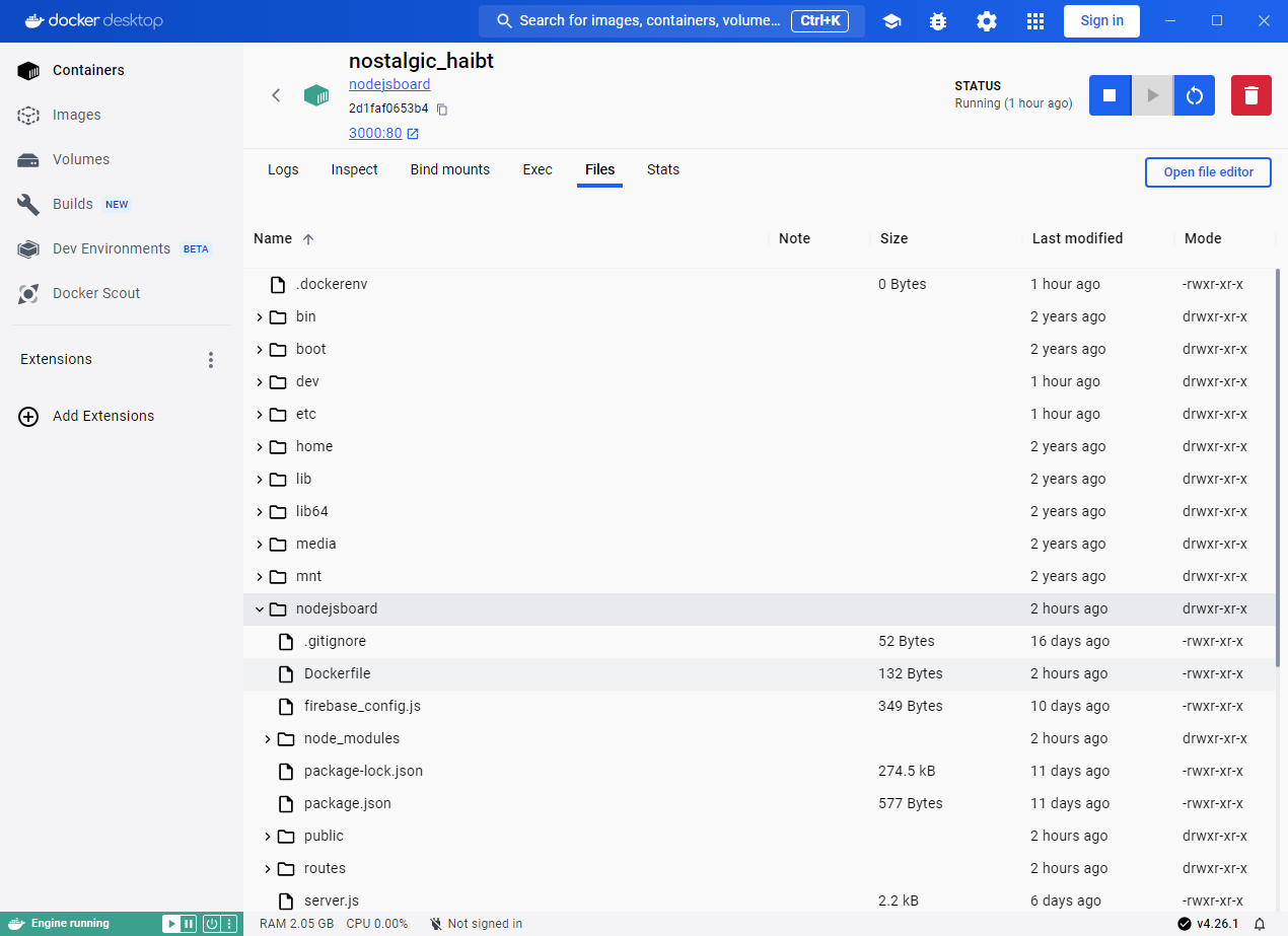 - 위에서 도커데스크탑에서 실행 중인 컨테이너를 클릭하고, Files를 보면, 폴더 구조를 확인할 수 있다.(아래 nodejsboard 가 있는지 확인)