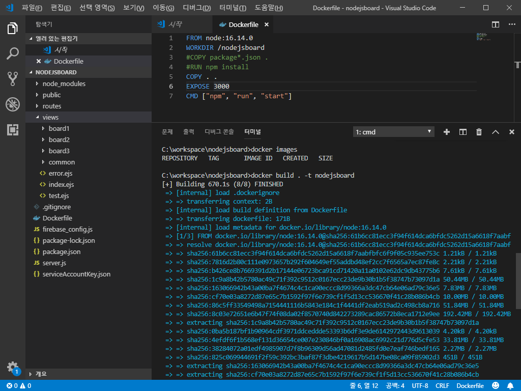 - 도커 이미지를 만든는 빌드 명령어 : docker build . -t nodejsboard (아래 docker images 로 기존 도커 이미지가 있는지 확인 후 빌드실행)