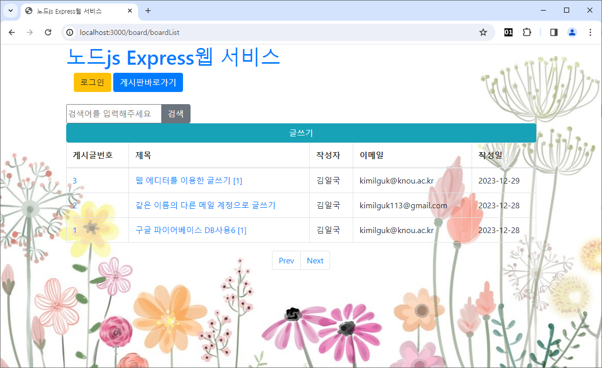 - 위에서 포트 옆의 링크 아이콘을 클릭하면, 웹브라우저에서 컨테이너로 실행한 3000번 포트의 노드js보드 앱을 확인 할 수 있다.(아래)