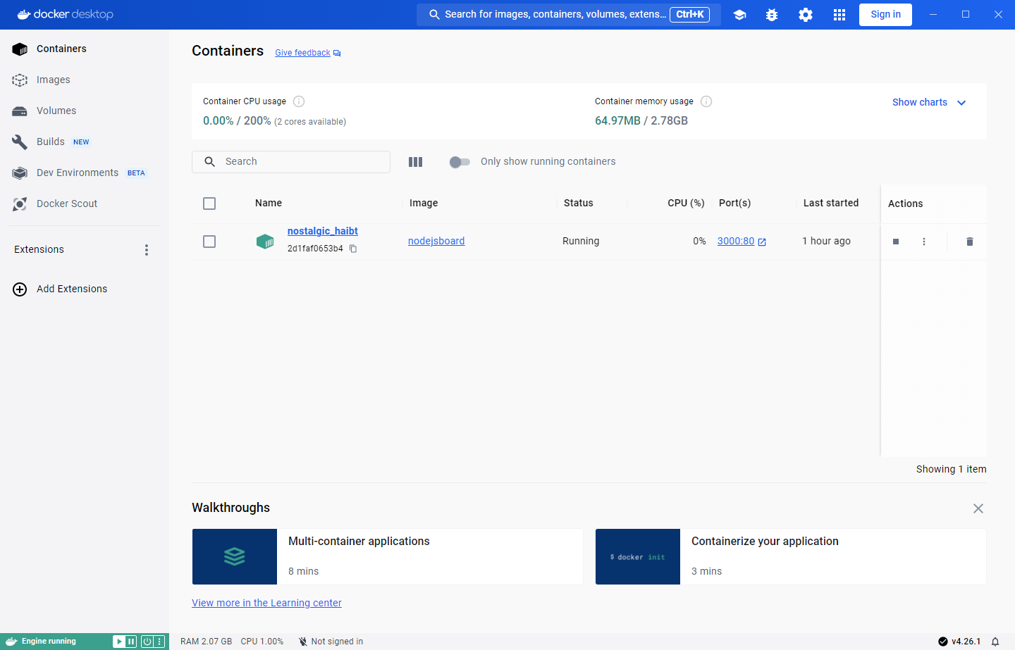 - Containers 메뉴에 실행된 컨테이너 이름과 ID 및 포트가 보인다.(아래)