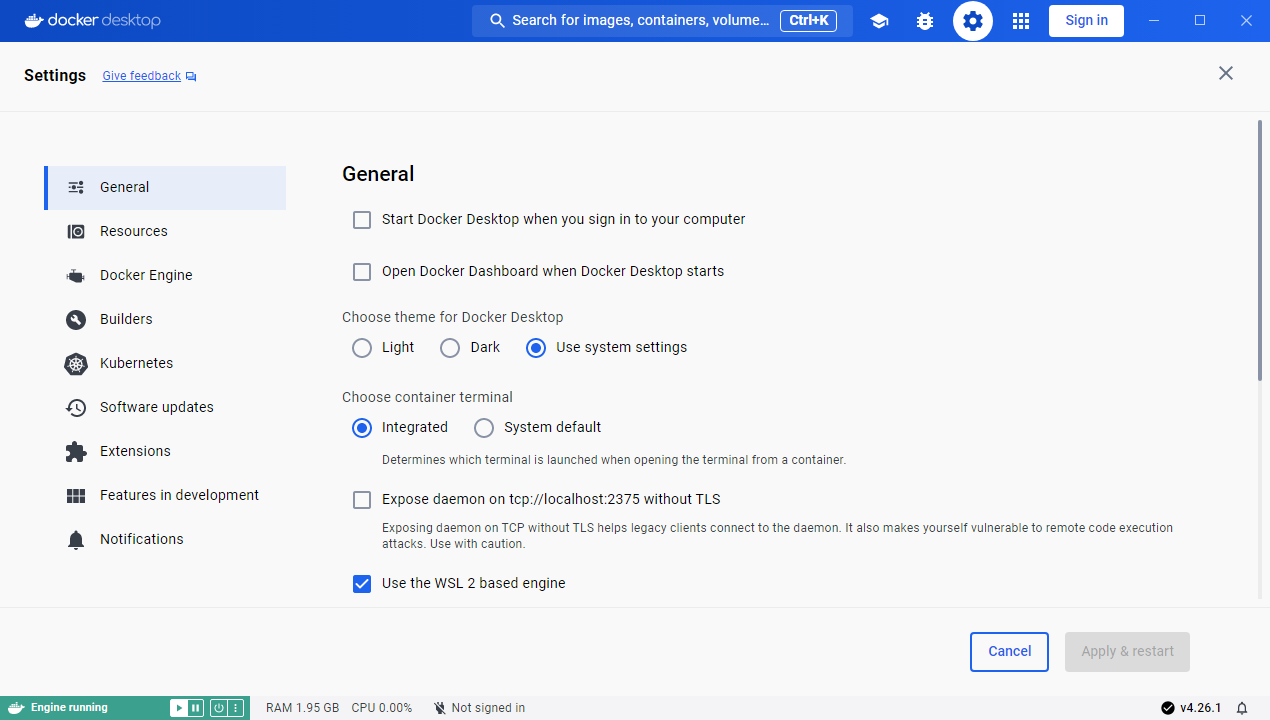 - General 의 실행 시 Docker Dashboard 오픈을 체크 해제하고(실행속도때문), WSL2 based engine 부분이 제대로 체크 되어 있는지 확인 한다.(아래)